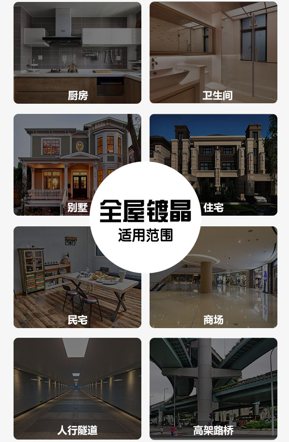 除了以上多種優(yōu)點之外,全屋鍍晶于多種材質(zhì)表面保護,如:各種漆面、金屬、石材、陶瓷、水泥板、合成板、塑膠板、PVC、磚瓦、鋼結(jié)構(gòu)、不銹鋼、鋁材、混凝土、木材、軟瓷、玻璃等材質(zhì)表面,適用于廚房、衛(wèi)生間、別墅外墻、高檔建筑物外墻、涼亭、護欄、高鐵、飛機、軍艦、戰(zhàn)斗機等場所和物體的防護。具有極佳的戶外耐候能力,延長被保護物體的使用壽命。