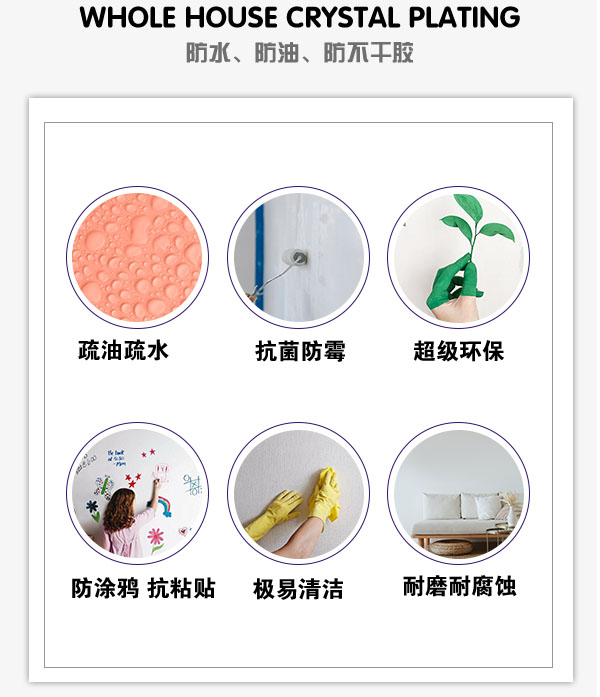 全屋鍍晶膜由我司教授和博士團隊采用最新的納米級硅分形組合技術(shù)研發(fā)而成,具有超強疏水疏油特性和自潔效果的功能涂層,水性筆、油性筆、油污、不干膠甚至手噴漆等污漬都很難在上面附著,極易清潔,適用于乳膠漆墻面、壁布、硅藻泥、藝術(shù)涂料、大理石、集成墻板等多種材質(zhì)。