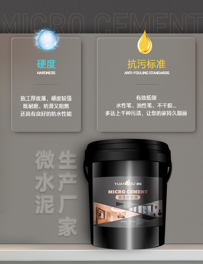 微水泥系列(又名納米水泥/清水混泥土)作為新一代表面裝飾材料,具有強(qiáng)度高、厚度薄、無(wú)縫施工防水性強(qiáng)等特點(diǎn),主要成分是水泥、水性樹(shù)脂、改性聚合物、石英等材料。 產(chǎn)品還配套由源蔻自主研發(fā)的納米級(jí)硅分形組合材料-鍍晶涂層,可直接刷到微水泥表面,在保護(hù)物表面形成高硬度的空氣保護(hù)層,讓油性記號(hào)筆、不干膠甚至手噴漆等污垢無(wú)法在表面附著,只需清水即可清洗,使之保持高清潔度。